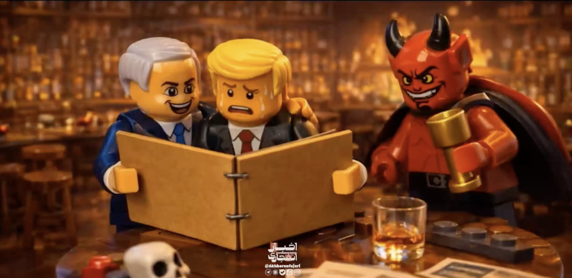 Il video è costruito come una breve animazione senza dialoghi ma con una forte componente simbolica. Nelle prime scene compaiono le versioni giocattolo dei due leader occidentali, Trump e Netanyahu, rappresentati come amici fraterni mentre si abbracciano. Accanto a loro appare anche la figura di un diavolo con le corna, elemento che rafforza la narrazione propagandistica.