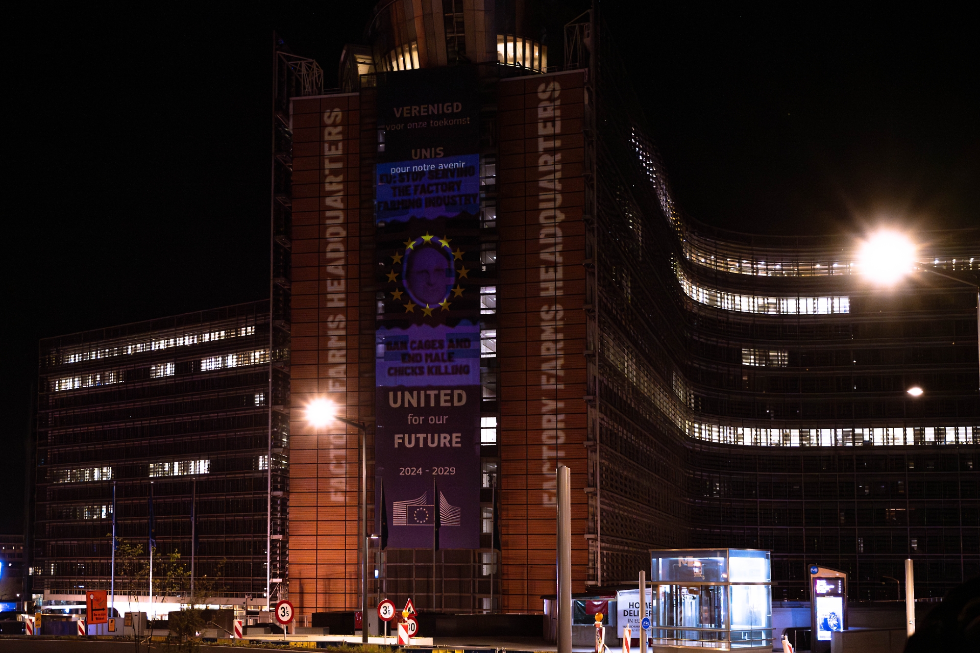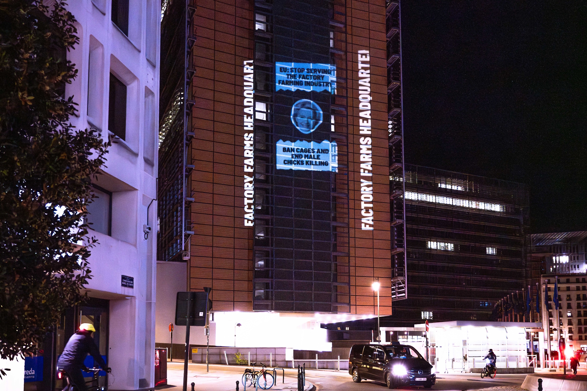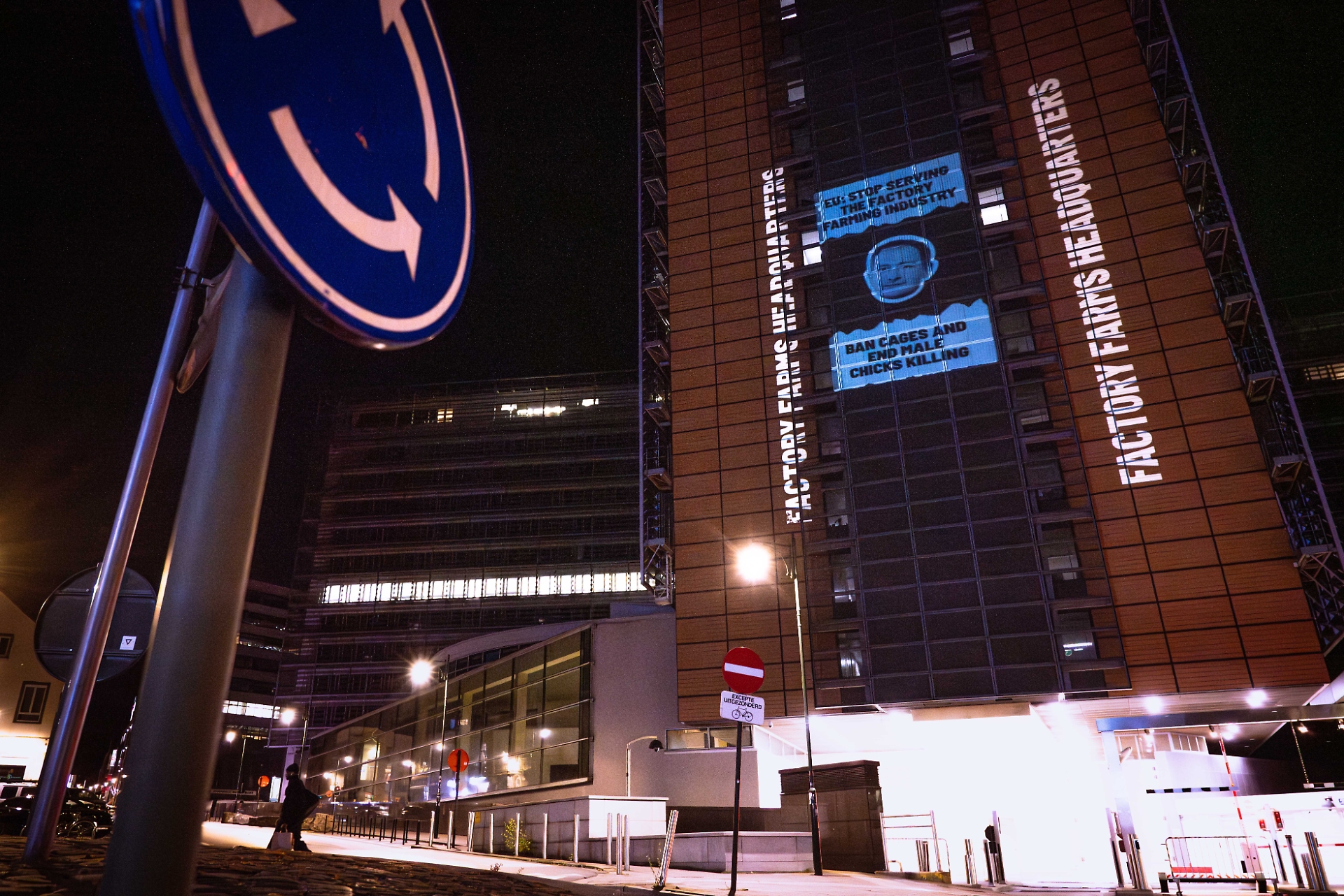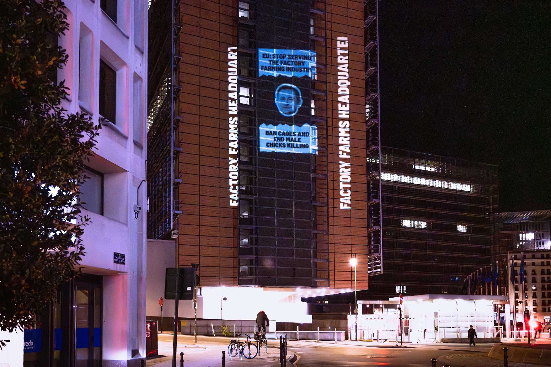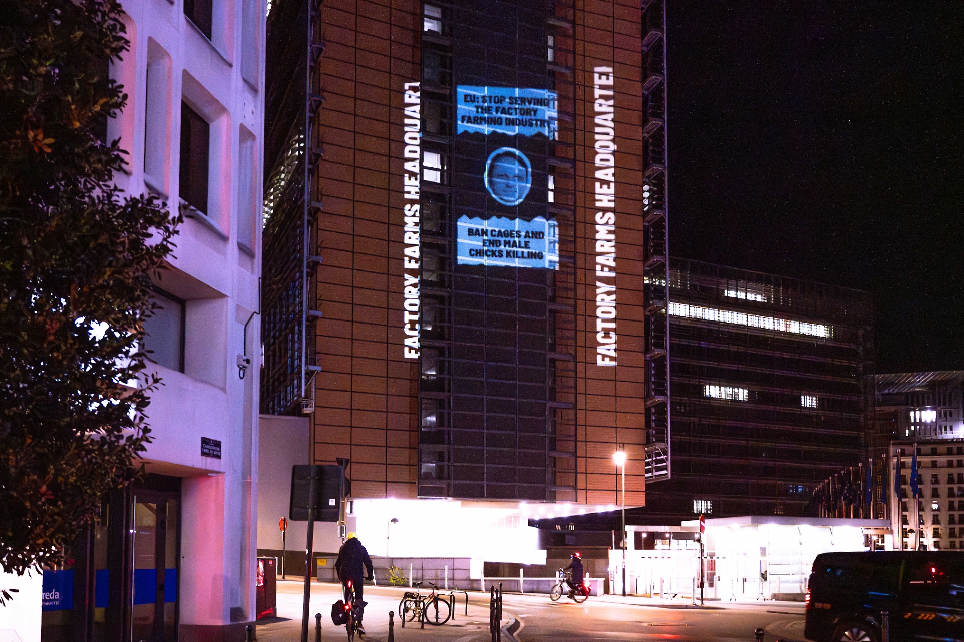 Sulle pareti dell’edificio sono comparse scritte come “Sede centrale dell'allevamento intensivo”, “UE: smetti di servire l'industria dell'allevamento” e “Vietate le gabbie e ponete fine all'uccisione dei pulcini maschi”, accompagnate dai volti della presidente della Commissione Ursula von der Leyen, del commissario europeo per la Salute e il Benessere degli animali Olivér Várhelyi e del commissario per l’Agricoltura e l’Alimentazione Christophe Hansen.