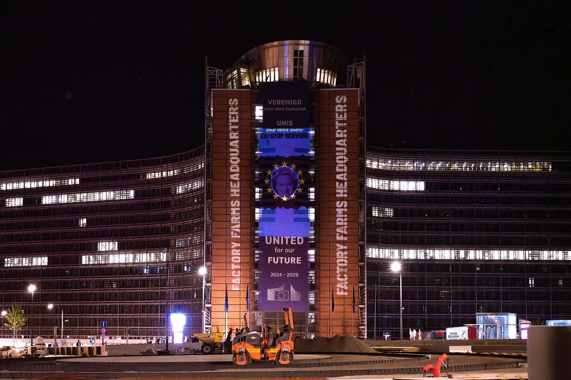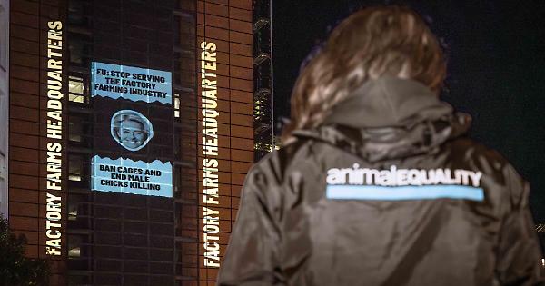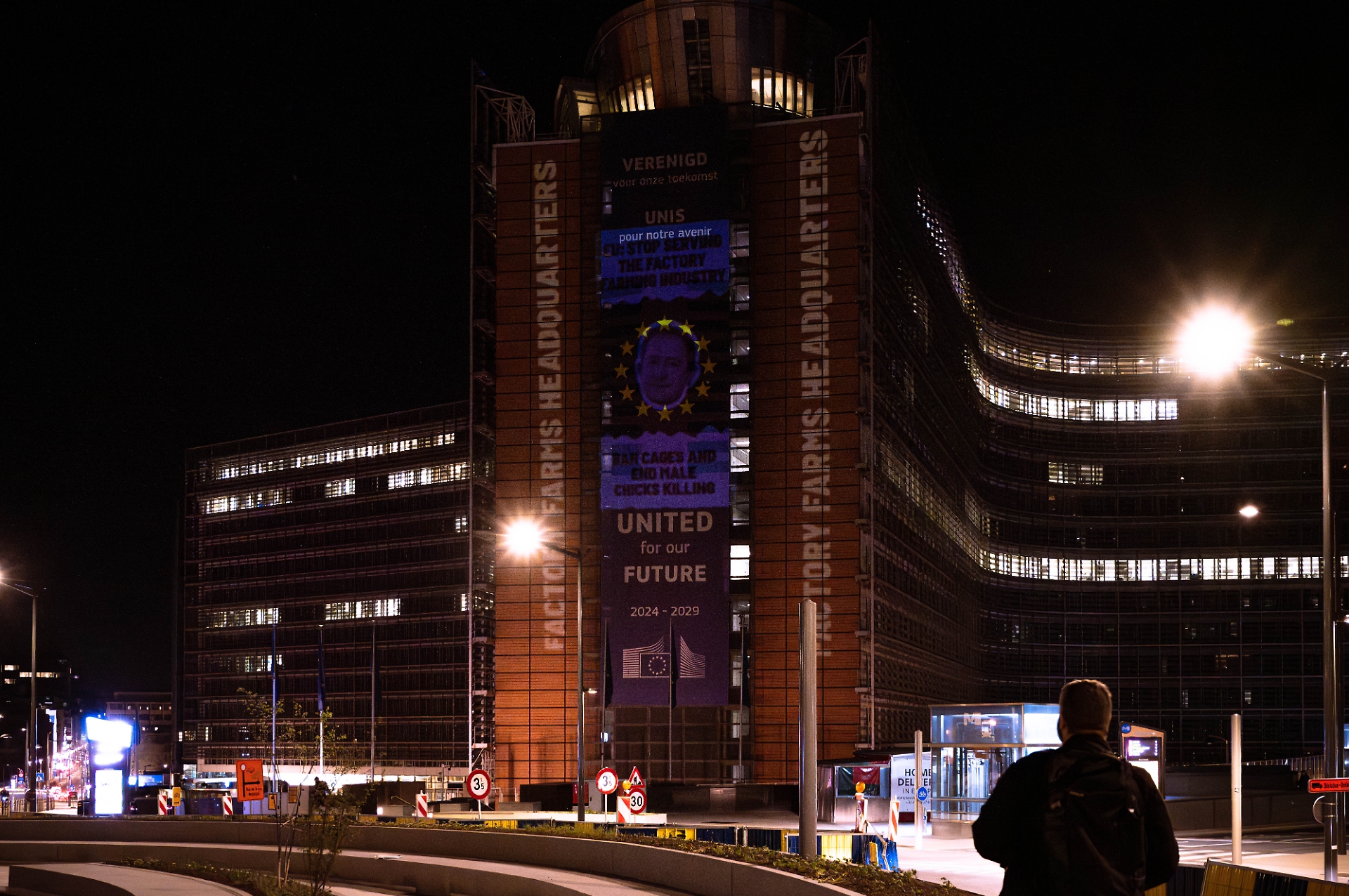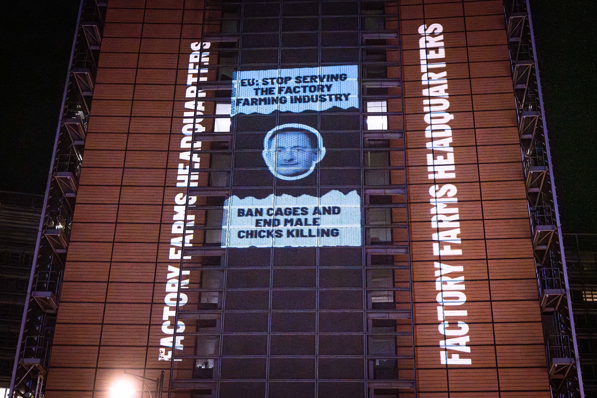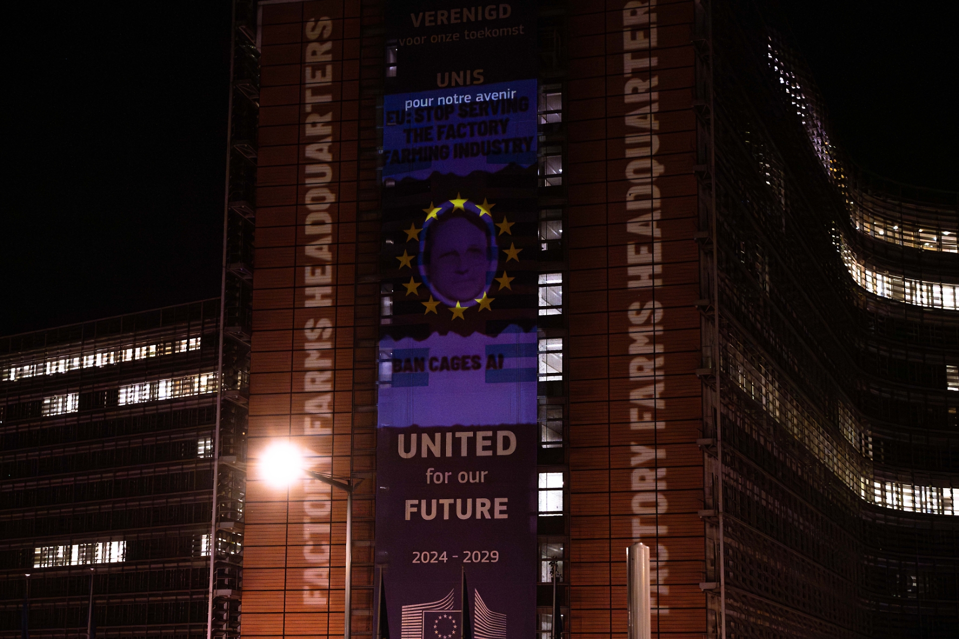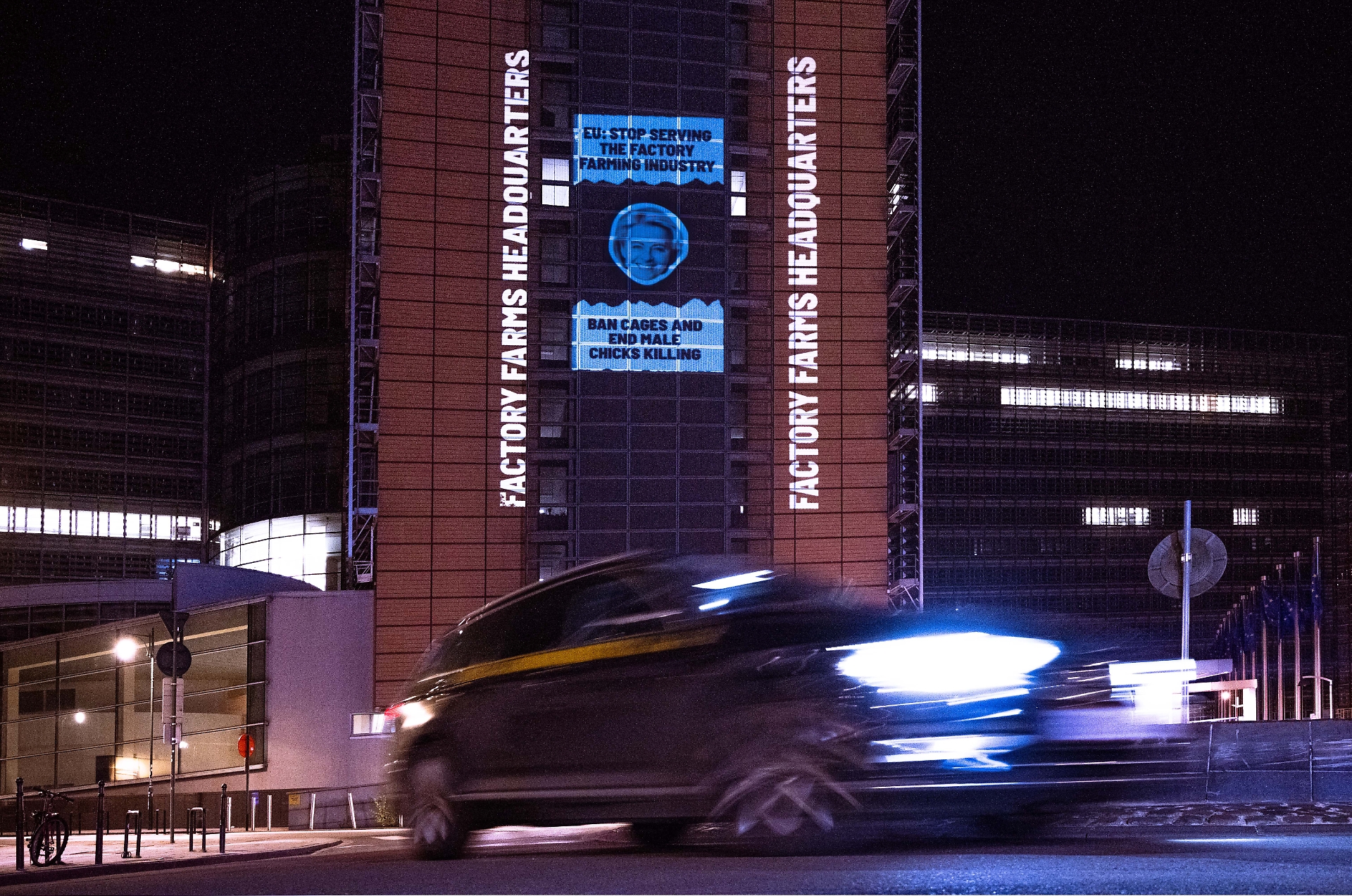 Sulle pareti dell’edificio sono comparse scritte come “Sede centrale dell'allevamento intensivo”, “UE: smetti di servire l'industria dell'allevamento” e “Vietate le gabbie e ponete fine all'uccisione dei pulcini maschi”, accompagnate dai volti della presidente della Commissione Ursula von der Leyen, del commissario europeo per la Salute e il Benessere degli animali Olivér Várhelyi e del commissario per l’Agricoltura e l’Alimentazione Christophe Hansen.