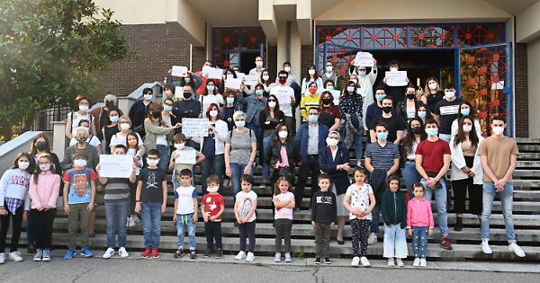 Genitori, bambini e ragazzi posano insieme a suora Emanuela Perucchini dopo un pomeriggio di commozione per la sua imminente e forzata partenza