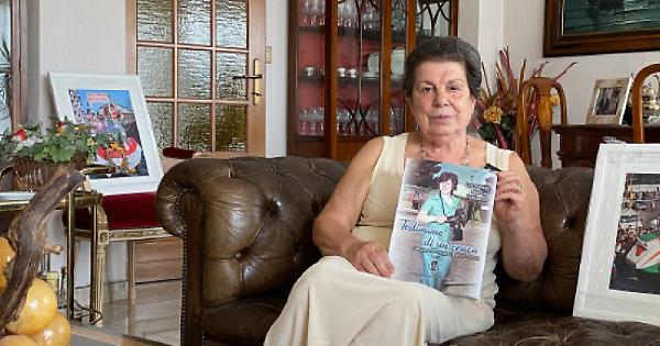 Leonarda “Leo” Mescia nel salotto di casa sua, in centro a Chivasso. Sotto la copertina del libro “Testimone di un’epoca”