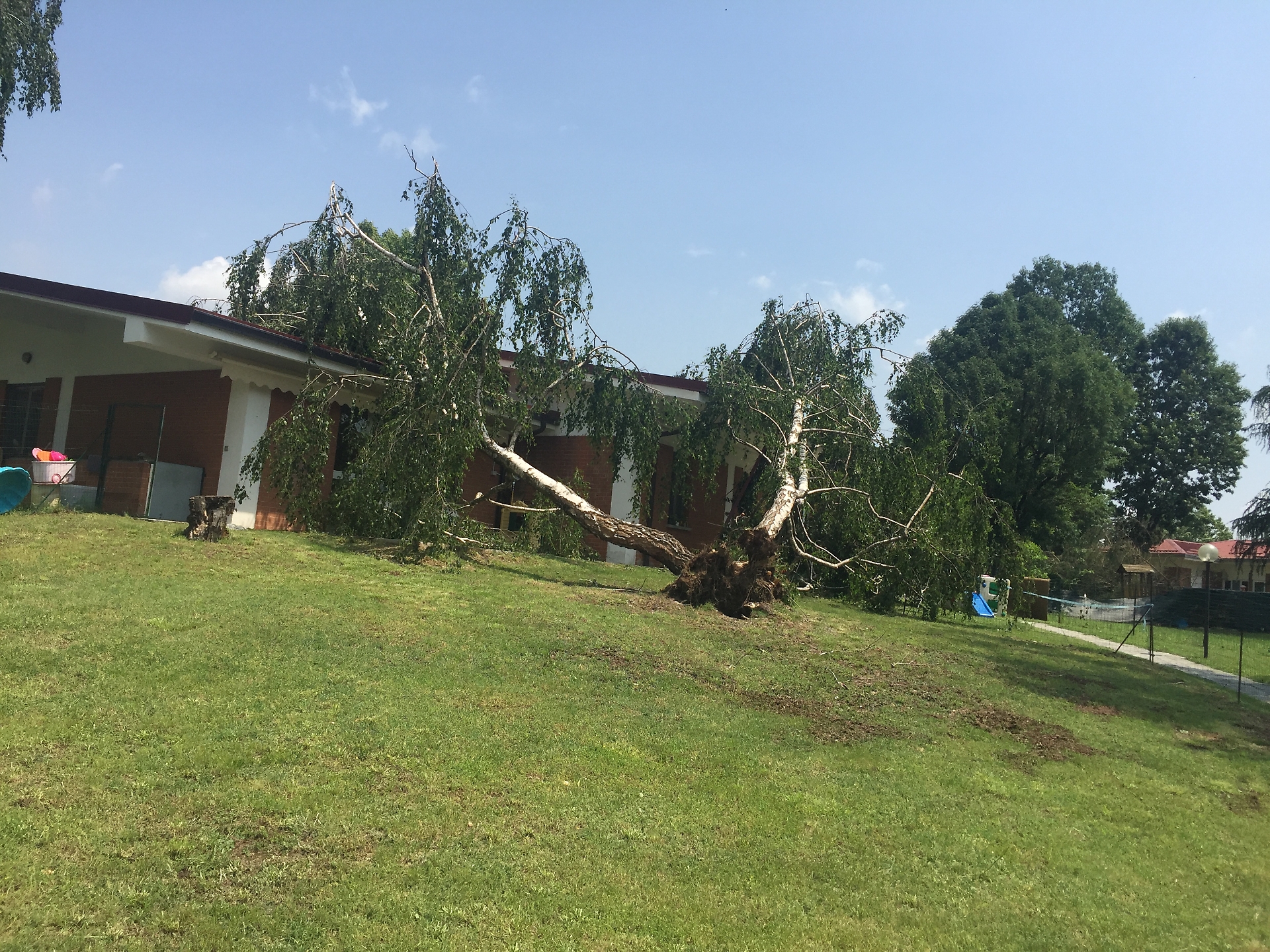 Sempre a Caluso il forte vento ha piegato una betulla che si è adagiata sulla copertura dell'asilo nido Baby Club di via Diaz, ma senza danneggiarla.