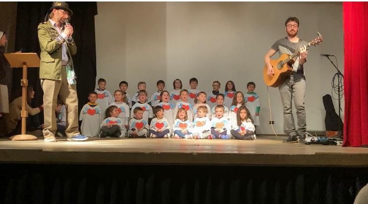 Il sipario si è aperto con una sorpresa emozionante: una ventina di bambini che frequentano la Scuola dell'Infanzia San Giuseppe Cottolengo di Brusasco ha cantato, insieme ad Angelo Finiguerra, la canzone “Supereroi” che l'artista Mr Rain ha portato al Festival di Sanremo dell'edizione di quest'anno. Accompagnati dal chitarrista Jacopo Garimanno della Scuola di Musica CMP Centro per la Musica in Piemonte di Cavagnolo.