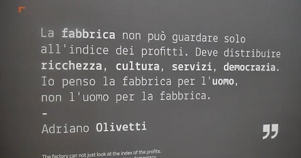 “La fabbrica non può guardare solo all'indice dei profitti deve distribuire ricchezza cultura servizi democrazia Io penso la fabbrica per l'uomo non l'uomo per la fabbrica” questo il pensiero cardine di Adriano Olivetti il celebre imprenditore italiano che riuscì a creare a Ivrea, nel secondo dopoguerra, un'esperienza di fabbrica unica al mondo.