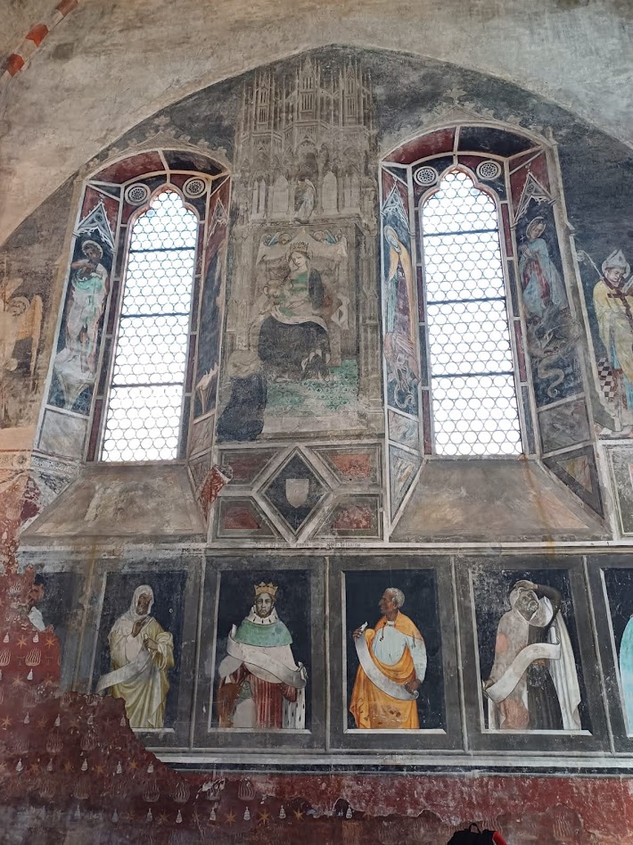 “Anche la cappella della sacrestia conserva affreschi di Jaquerio – prosegue Marta Fusi –. Sulla volta sono raffigurati i quattro Evangelisti, ognuno dei quali è identificabile, grazie al simbolo che gli è proprio; sulla parete sud sono effigiati i santi Pietro e Paolo, a est l’Annunciazione, a nord la Salita al Calvario, a ovest la Preghiera nell’Orto degli Ulivi”.