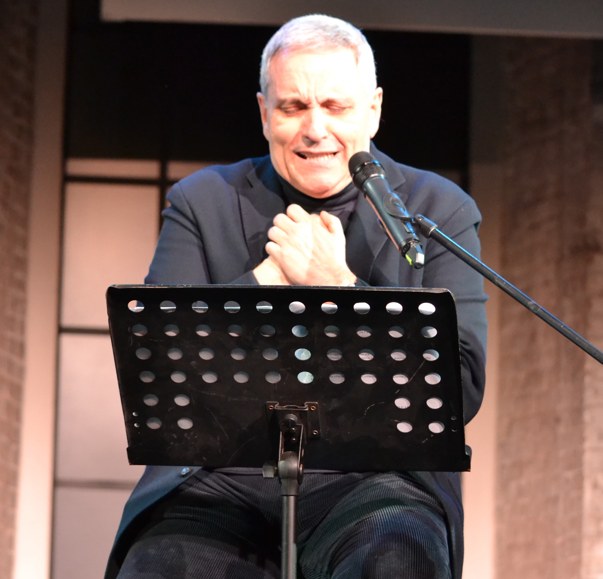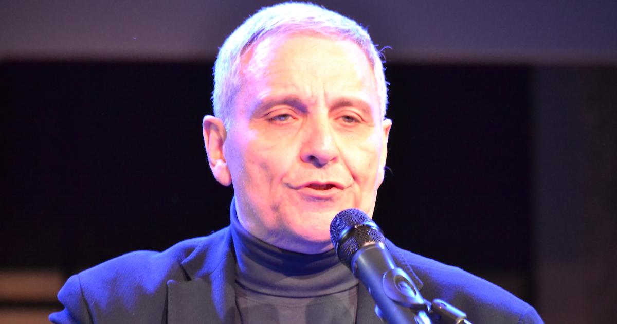 Maurizio De Giovanni mentre recita dei versi del romanzo
