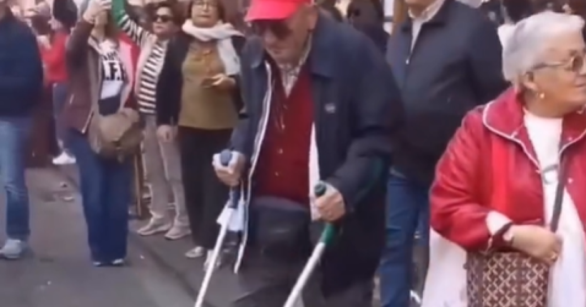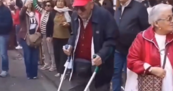 Nel video, ripreso durante una delle tante mobilitazioni italiane contro la guerra a Gaza, l’uomo si muove a ritmo tra la folla, sostenuto solo dal suo equilibrio precario e dall’entusiasmo dei manifestanti che lo circondano. Le sue stampelle diventano parte della danza, un’estensione del corpo che si rifiuta di restare fermo.